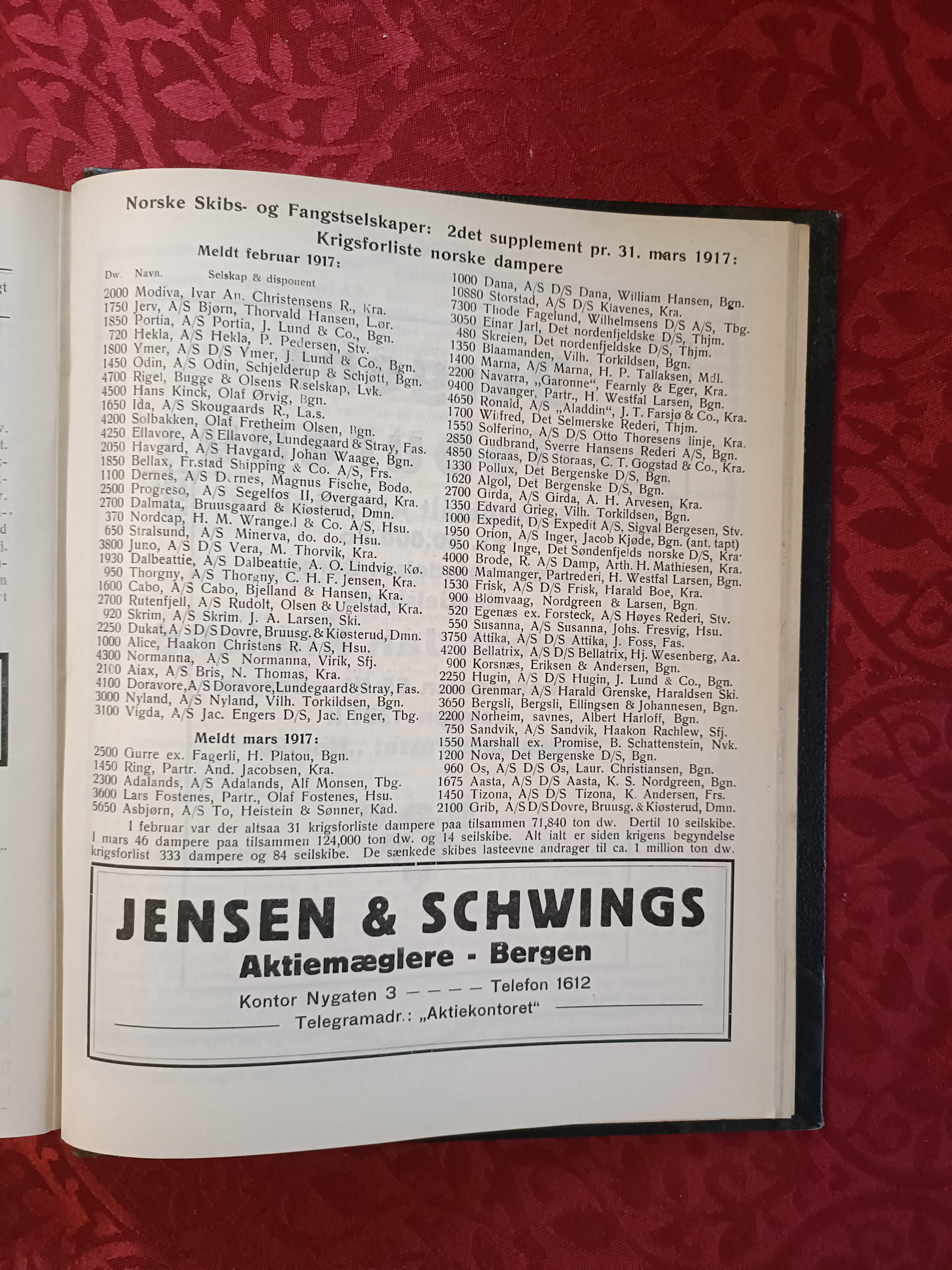 Bind I: 411 større skibsselskaper. Juni 1916, 2.opplag. 236 s. Bind II: Fangstselskaper - Rederifortegnelse og supplementer. Samt en ved Carl W. Salmonsen utarabeidet dødvegtliste. November 1916. Trondheim (F. Bruns Boghandel) 1916-1917. Privatbind. 236 + 32 + 272+ 24 + 24 sider . Stempel på tittelbladet. Alt bundet i ett bind.